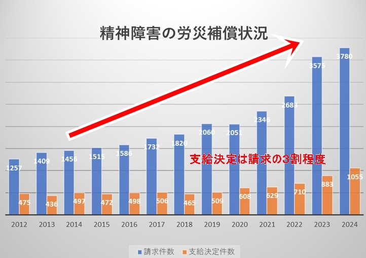 厚生労働省が令和6年度の精神障害の労災補償状況を公表しています。請求件数は過去最多の3780件、支給決定件数も前年度比172件増の1055件に達しています。しかし、不支給を含めた支給決定3494件のうち支給決定された割合、つまり認定率は30・2%にとどまり、前年度の34・2%を下回っています。精神障害の労災認定はとても厳しいと言えるでしょう。